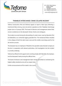 “Tefoma Construction (Pvt) Ltd (Tefoma) regrets to report a fatal injury following a mechanical failure during crane de-erection operations at the Trabablas Interchange project site on 6 January 2025.