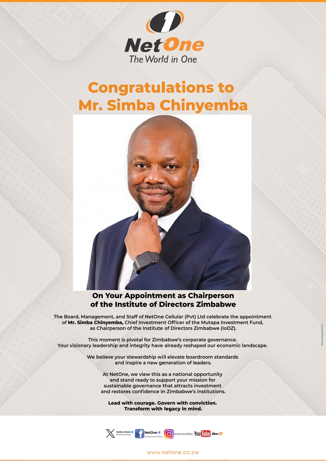 “The Boad, management, and staff of NetOne Cellular (Pvtd) Ltd celebrate the appointment of Mr Simba Chinyemba, Chief Investment Officer of the Mutapa Investment Fund, as Chairperson of the Institute of Directors Zimbabwe.