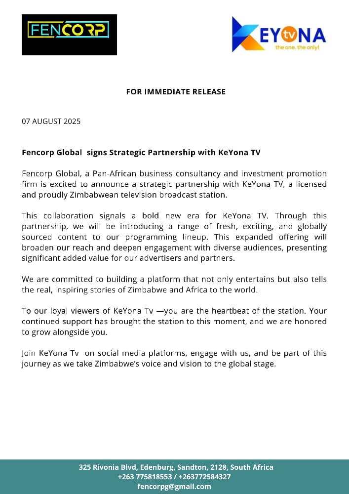 Fencorp Global, a Pan-African business consultancy and investment promotion firm, has signed a strategic partnership deal with KeYona TV, a licensed Zimbabwean television broadcasting station.
