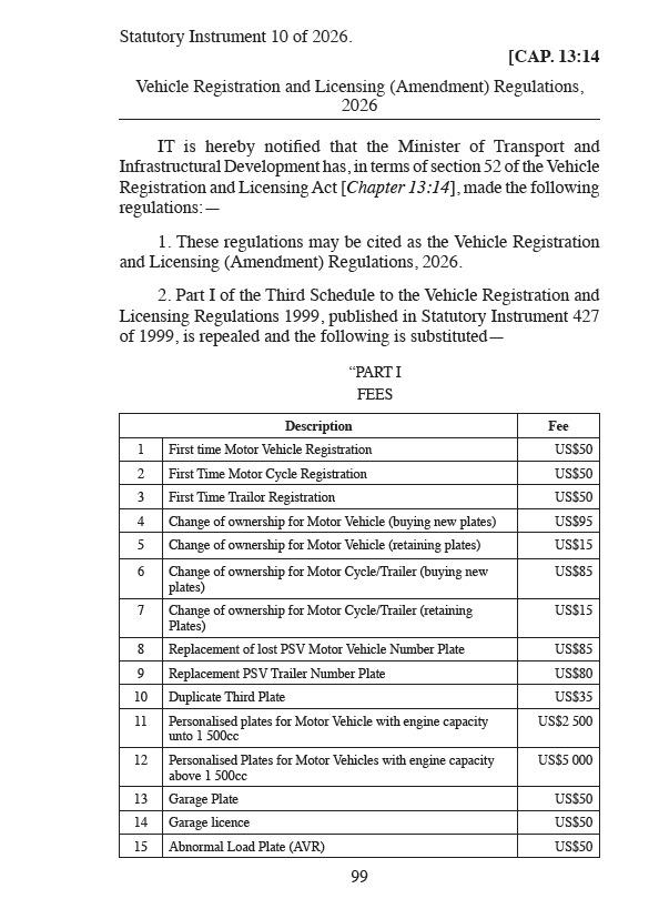 HomeNewsGOVERNMENT REVIEWS VEHICLE REGISTRATION, LICENSING FEES News GOVERNMENT REVIEWS VEHICLE REGISTRATION, LICENSING FEES By Reporter January 13, 2026 0 58 Share TwitterFacebookPinterestWhatsAppLinkedin Share TwitterFacebookPinterestWhatsAppLinkedin Previous articleFamily demand answers from suspect who killed their brotherNext articleFormer Chegutu West Legislator Dexter Nduna to appear in court Reporter RELATED ARTICLES News HEXCO results out January 20, 2026 News Prophet T Freddy’s church nears completion January 19, 2026 News Govt to limit number of subjects for O, A Level exams January 18, 2026 LEAVE A REPLY Cancel reply Comment: Please enter your comment! Name:* Please enter your name here Email:* You have entered an incorrect email address! Please enter your email address here Website: Save my name, email, and website in this browser for the next time I comment. Δ - Advertisment - Most Popular HEXCO results out January 20, 2026 Woman kills twins..bury them in a shallow grave January 19, 2026 End of road for armed robbers after jailed 81 years January 19, 2026 Prophet T Freddy’s church nears completion January 19, 2026 Load more Recent Comments Cathbert Shephard Kurahwa on O Level results out…pass rate at 35.26 percent Modesty: A Lost Virtue – Between Two Cultures on Zimbabweans watching too much pornography Gift on Hip hop musician Runner Rulez granted US$100 bail Reporter on Police warn dog owners in Harare Bliss chimusasa on Police warn dog owners in Harare Nyasha on Yvonne Matanhire: The Burning Star Maka on Woman kills self after discovering lover’s marriage Shingirai Manyengavana on Veteran actress Stella January dies
