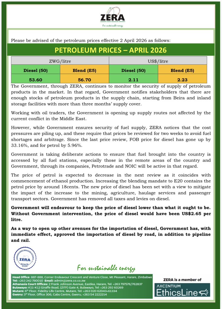 However, while the Government ensures fuel supply security, ZERA notes that cost pressures are mounting; therefore, prices need to be reviewed for two weeks to avoid fuel shortages and arbitrage.